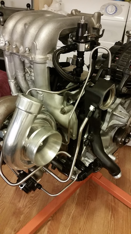 I've thought about redoing the manifold, maybe in Schedule 40 next time and more evenly like yours and to fix the slant (the current mani has a 5 degree slant down towards the front of the car), but with the way this turbo is made I'm not sure I'd have much luck. If I do though, I'm going to see if I can get enough room to use either hard lines or AN.